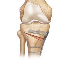 Gesloten wigosteotomie – Hierbij wordt een botwig verwijderd, meestal net onder het gewricht in het bovenste deel van de tibia. Bij patiënten met artritis die het mediale compartiment (varusknie) aantast, wordt de botwig uit het buitenste deel van de tibia genomen. Zodra de botwig is verwijderd, worden de twee botuiteinden aan elkaar gezet en vastgezet met een metalen plaat met schroeven.